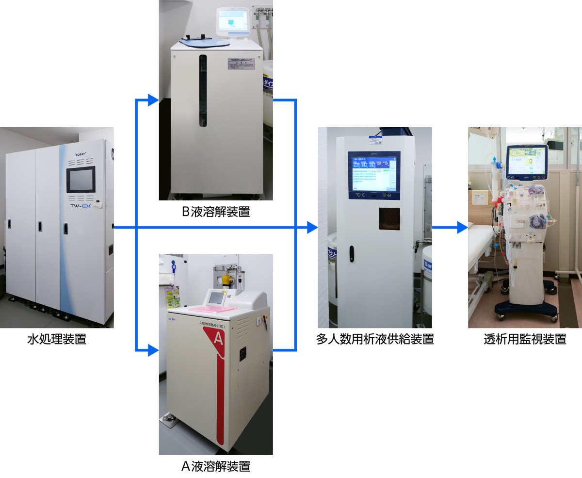 専門的になりますが、水処理装置(一般的には逆浸透膜濾過装置(RO装置)と言います)で水道水中の塩素・微生物などを除去したのち、透析液溶解装置(透析液を作成するのに必要なA液・B液を作成する装置)および多人数用透析液供給装置(治療に使用する透析液を作成する装置)で作成された透析液の濃度を厳密に管理し透析装置へ供給しています。