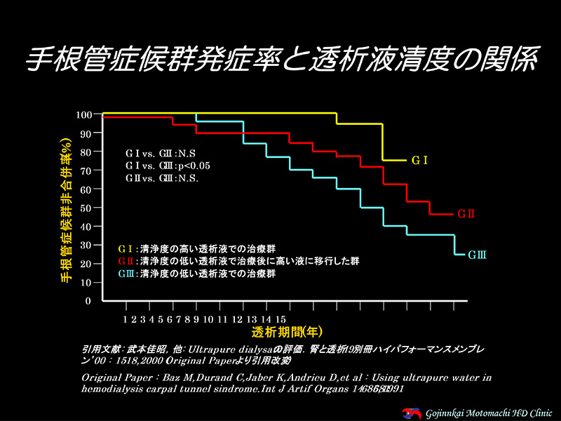 元町HDクリニックでは、長期透析患者さんの合併症である透析アミロイドーシスの代表的な症状である手根管症候群の発症率と透析液清浄度の関係が報告されていることから、日本透析医学会および日本臨床工学技士会の提唱する透析液水質基準2016に準じてエンドトキシンと生菌測定を行っております。エンドトキシンは0.001EU/mL未満(測定感度未満)、生菌数は0.1CFU/mL未満の超純粋透析液を担保しております。また、エンドトキシン測定は東亜ディーケーケーの生物発光法(Luminutes-ET)を、生菌測定はADVANTEC社製37mmクオリティモニターを使用しています。