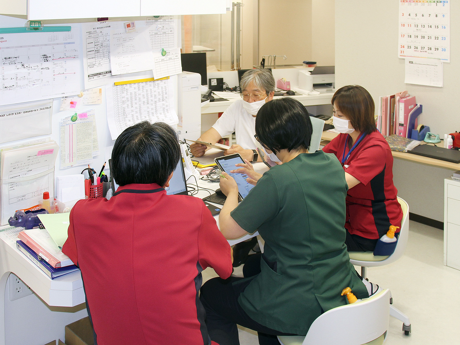 私達看護師は、患者様が安全で安心して透析治療が行う事を目標としています。透析患者様は、日常生活や社会復帰など色々な不安があります。看護師は日常生活の情報を収集して、異常の早期発見に努めています。透析以外にもいろいろな疾患がある方がいます。透析以外の疾患に対しても、患者様、ご家族様に耳を傾けて、心理的、精神面のサポートも行っています。色々な疾患に対して医師とカンファレンスを行い、最善の治療を提供しています。
