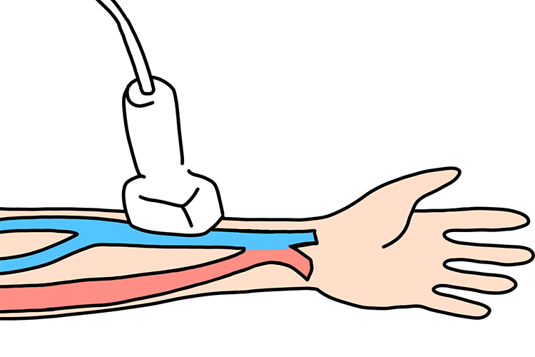 血液透析では、腕に作った「シャント(動脈と静脈をつなぎ合わせた太い血管)」から血液を体の外に取り出します。