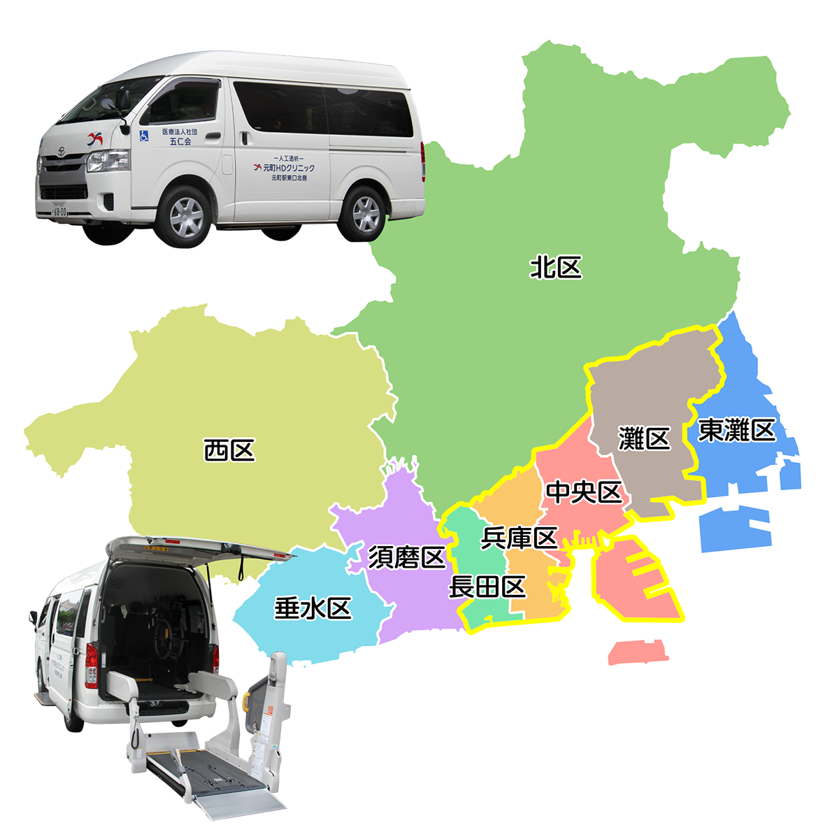送迎範囲は長田区、兵庫区、中央区、灘区を中心に送迎可能です。(送迎エリアについては地図をご参照ください)